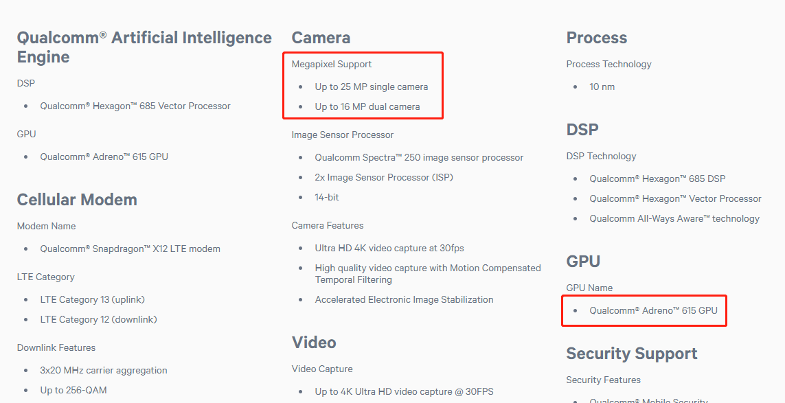 其他变化包括,GPU为Adreno615,基带为骁龙X12,最高支持25MP单摄或者16MP双摄,这些参数都比骁龙710有所降低。