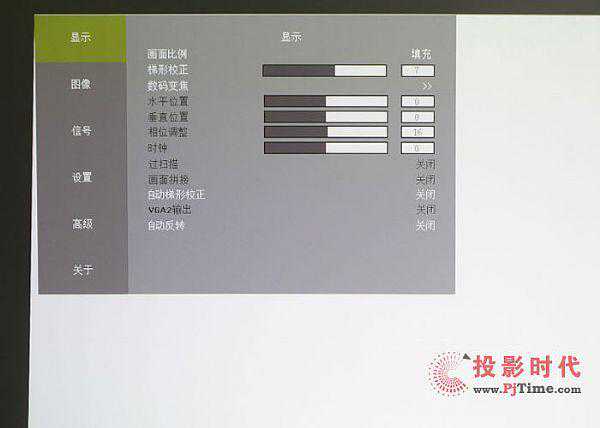显示菜单包括画面比例的选择、梯形校正、数码变焦、水平位置、垂直位置、相位调整、时钟等方面的调节,可轻松调节至合适的演示画面效果。
