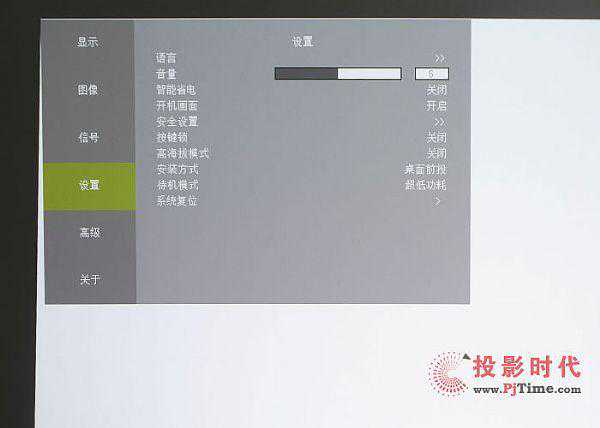 设置菜单里可按安装场景挑选前投和背投模式选择、音量调节、语言选择、智能省电选择、开机画面选择、安全设置等,满足了商教演示的复杂环境需求。