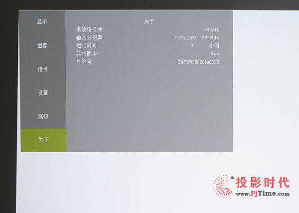 最后,为方便用户查看机器参数,索诺克SNP-UW380C超短焦激光投影机还设置了关于机器相关显示,譬如活动信号源、输入分辨率、运行时间、软件版本以及序列号等,菜单设计方面非常人性化。