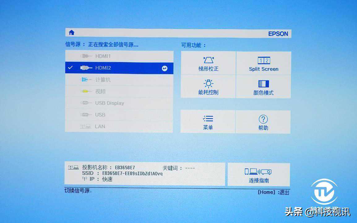 投影机在开机后如果没有接驳输入信号,那么会自动进入HOME菜单,此外按下遥控器右下角的HOME按钮也可以随时进入菜单。这里的设计功能倒是非常简约的,左侧为输入接口菜单,右侧为梯形校正、分屏、能耗控制、颜色模式。在菜单下部还有可以通过WIFI连入的方式说明。