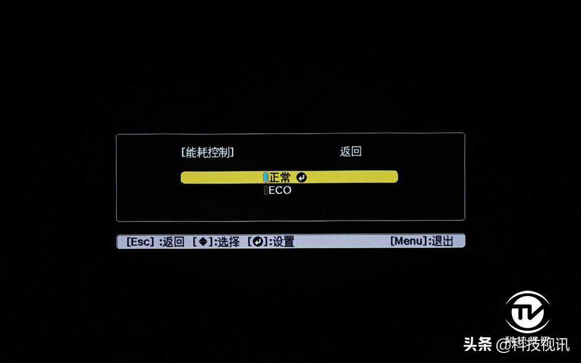 能耗控制方面很简单,只有正常和ECO两档选项。ECO模式下可以大大延长灯泡的使用寿命,开启ECO模式后画面会明显变暗一些,但对比度似乎有点提升。
