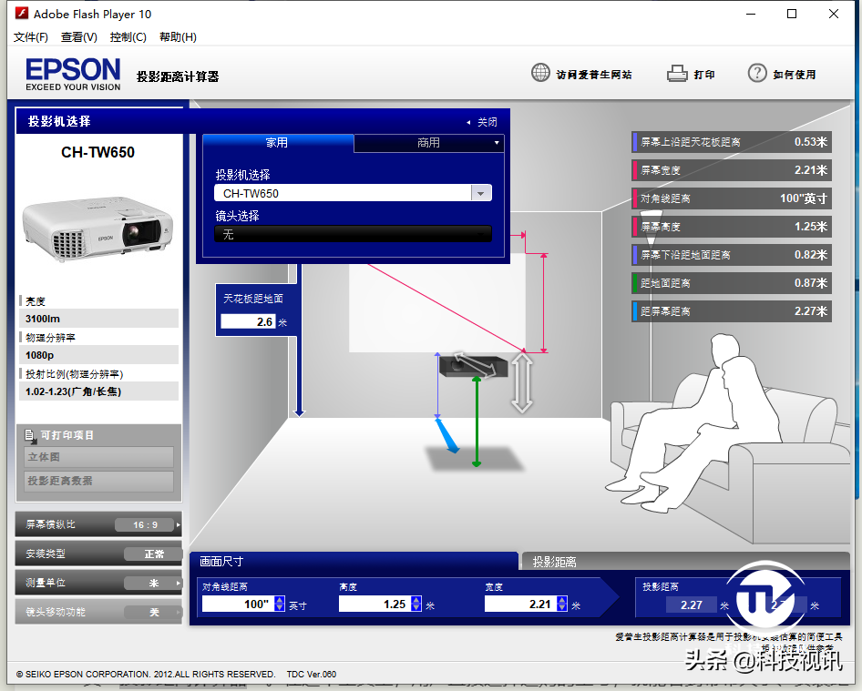 看过了投影机的外观之后,接下来就进入了实际体验环节。很多投影仪用户总是对安装距离和投影幕布到底买多少寸的问题非常纠结,针对这个问题,爱普生则比较人性化的提供了一个小工具“投影距离计算器”。用户可以通过选择购机的型号,就能看到幕布大小、观看距离以及对应高度等关键信息。选项中没有CH-TW610项,所以选择了非常接近的CH-TW650。
