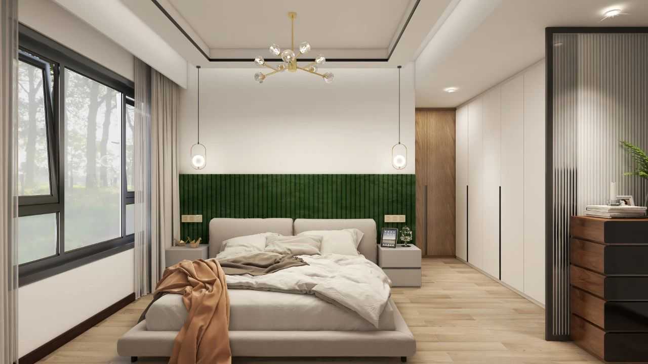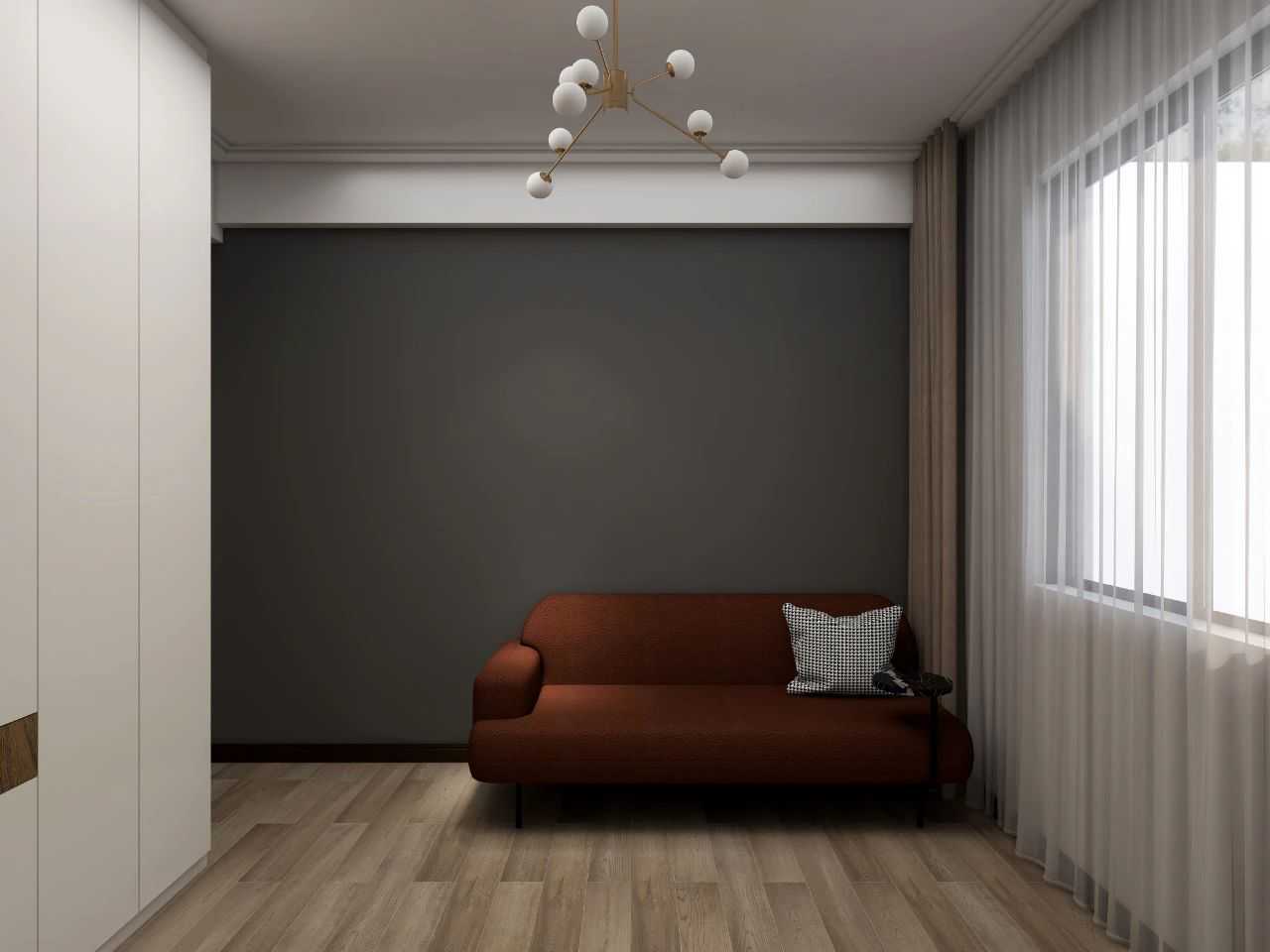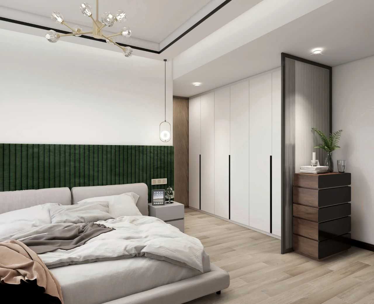 Becausethedoorofthemasterbedroomisfacingthesofainthelivingroom,thedesignerusesChanghongglasspartitioninthebedroomtoavoidtheshortcomingof"seeingintothebedroomataglance"andprotectitsprivacy.