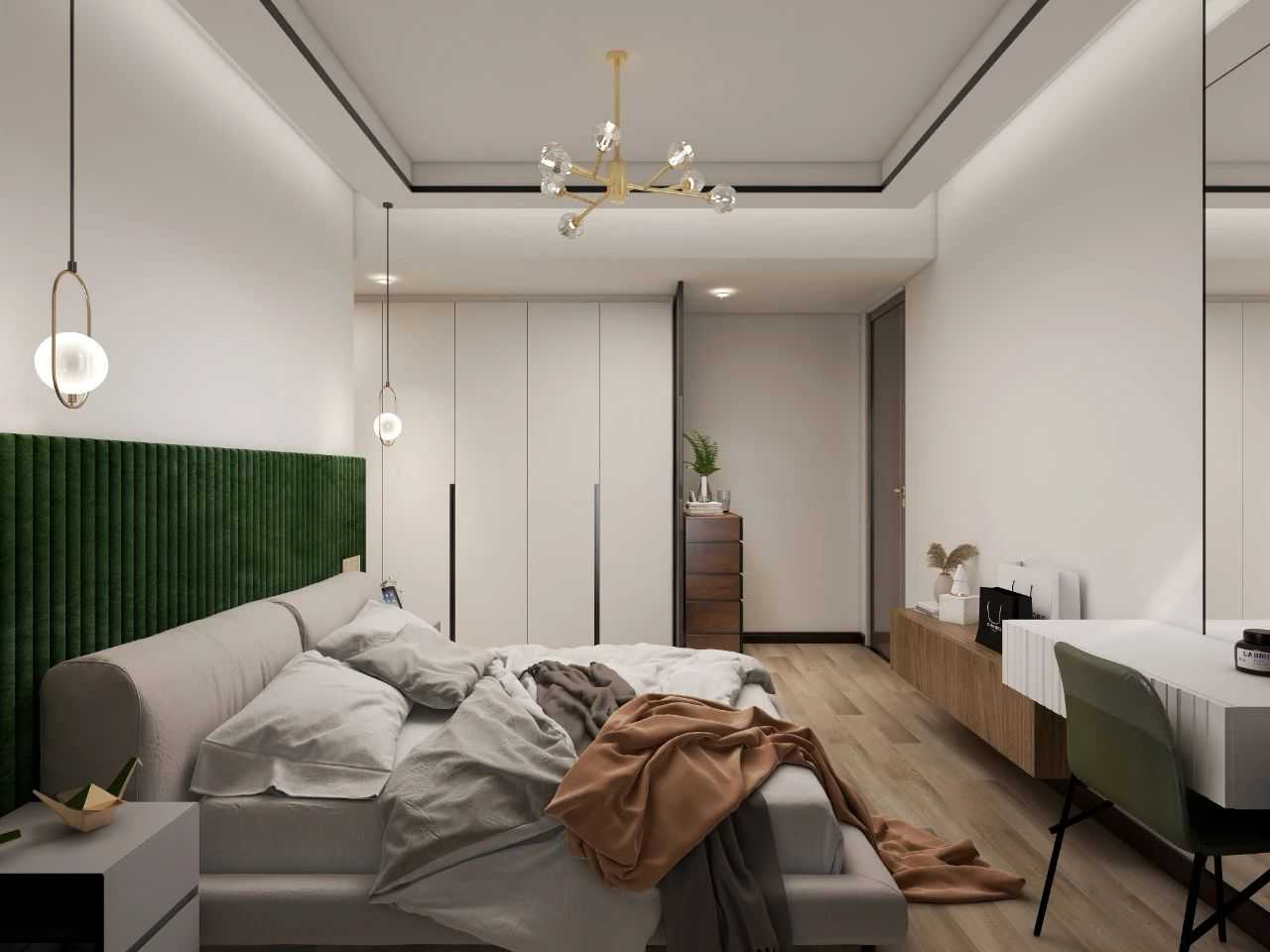 Theintegratedsidecabinet+dressingtableuseswoodandwhitetodistinguishthetwo,whichcanvisuallydividethesenseoffunction,andthespaceisnolongermonotonous.