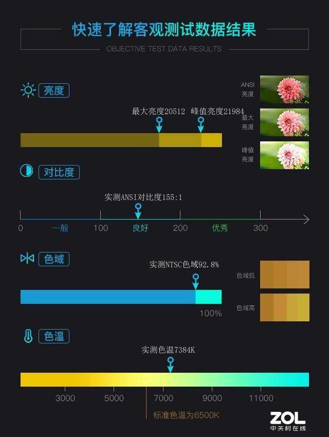 实测数据显示,爱普生CB-L20000U工程投影机的峰值亮度为21984流明,最大亮度为20512流明,均超过了标称值;ANSI对比度高达155:1,达到了良好的标准,画面色彩对比会更为突出;实测NTSC色域为92.8%,满足展览展示行业的应用;色温为7384K,确保了不同颜色的准确呈现。