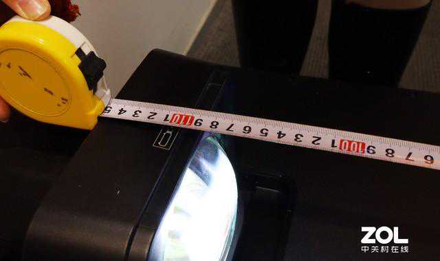 为了让大家看的更直观一些,我们把投影机搬到了只有一米多的狭窄走廊上。根据我们的实际测量,投影机在1.1米左右的距离本机即呈现出了超过百吋的大画面。同时这款超短焦镜头是从投影机背后投影,这种方式更有利于节省空间。
