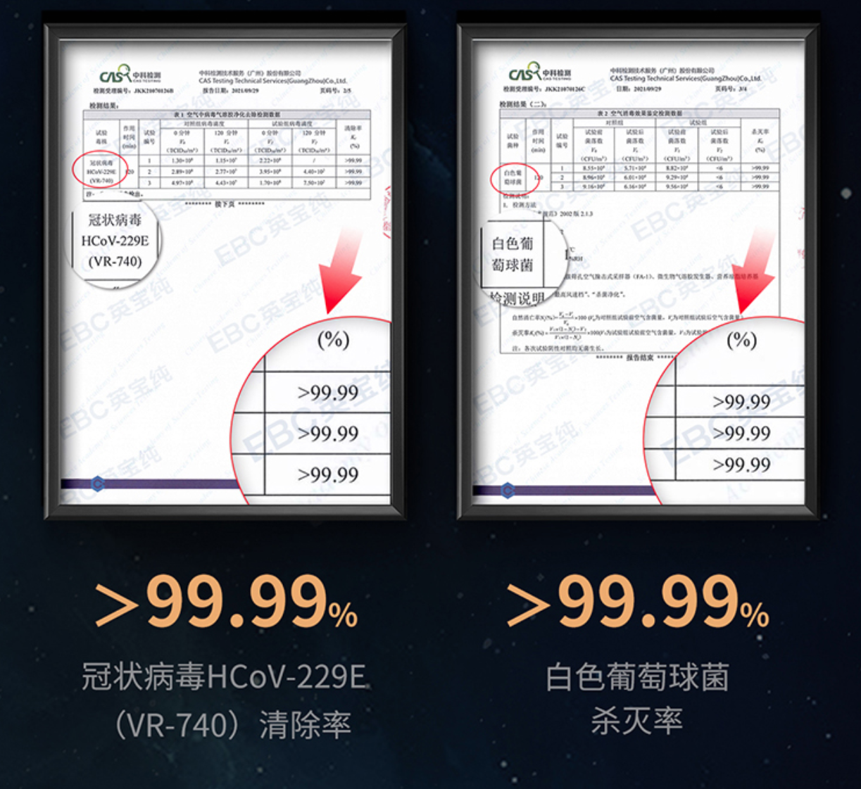 △△从检测报告可以看出,EBC英宝纯柜式空气环境机对冠状病毒HCoV-229E(VR-740)的清除率可以达到99.99%以上,对白色葡萄球菌的杀灭率同样可达99.99%以上。