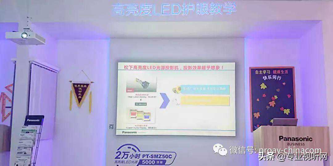 走近松下展台,首先先被松下专属静态展示区“20000小时持久光源”的巨大醒目标语所吸引。这里展示了松下商教投影机激光光源、高亮度LED光源、灯泡光源的主打机型及光源本体。使您可以直观欣赏松下商教投影机光源核心部件及投影机的外观。紧凑小巧的机身、简洁素雅的外形设计,使松下商教投影机不光在投影功能上表现出色,其高端大气上档次的外形也能成为各类教室中一道美丽的风景。