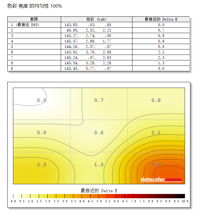 最大偏差在屏幕右下角达到5.0,整体表现一般