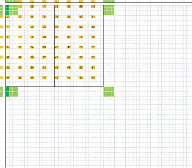 图2.maxas计算两个64x64矩阵相乘的示意图,绿色的4x4小片是线程0负责的那部分元素,黄色是其他线程负责那部分的左上角元素。图中只标出了左上角4x4矩阵的线程号,其他15个只是其重复。每个黑框中包含32线程,代表一个warp。这块32x32矩阵计算完成后,线程0以及其他线程保持相对位置,依次平移到另外三个绿色小片标出的地方,完成这个64x64矩阵的计算。左边的向量是A矩阵的一个列,上方的向量是B矩阵中与之对应的行,其中标为绿色的数据(各8个浮点数)是线程0所需要用到的,其他线程需要的不难类推。