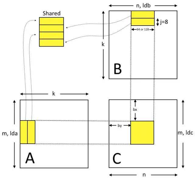 如果把小片看作一个元素,整个矩阵的规模相当于被缩小了倍。对于每个小片的结果可以由一组线程负责,其中每个线程对应小片中的一个元素。这个线程组将A的行小片和B的列小片一一载入共享内存,在共享内存上对其做矩阵相乘,然后叠加在原有结果上。这样对小片中的元素每载入一次可以被在高速的共享内存中被访问K次,由此得到远高于原始方法的内存存取效率。