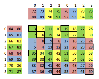 图中每一个格子代表一个线程负责载入的数据单元,绿色格子是线程0要先后载入的四个单元,黄色格子是其余31个线程第一次载入的那部分数据。整个warp每次载入两行,如此重复四次完成。在GPU上执行单位是32个线程组成的warp,所以64个线程是分为两个warp执行。其中一个warp(线程0-31)载入A另一个(线程32-63)载入B。此图有一个容易造成困惑的地方是图中的矩阵形状为而不是,这是因为后面每个线程会用到向量指令一次载入4个浮点数,即每个格子本身就是四个浮点数。在后面的代码中会看到在纹理内存上使用向量指令时偏移量会相对实际元素的数量除以4。