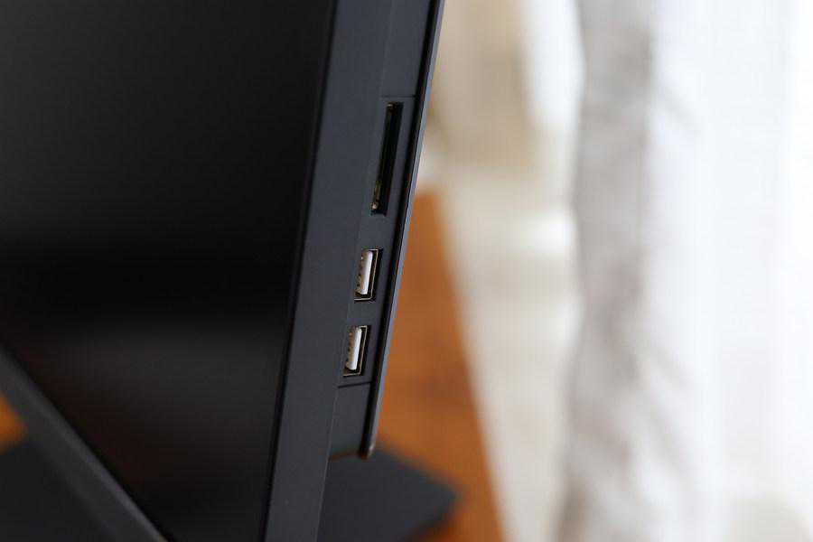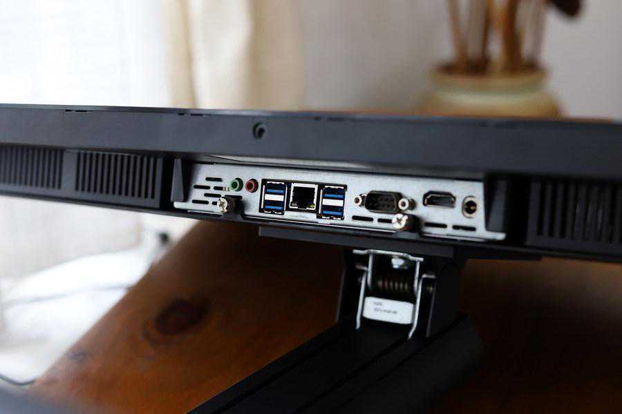 接口部分在一体机侧面配备了一个SD读卡器、两个接口,底部则配备了耳机、麦克风、、网线接口、9针COM口/HDMI接口,扩展能力和接口数量都令人满意,侧面的两个USB接口可用于鼠标键盘连接,底部的接口则可用于移动硬盘、U盘等对速度有一定要求的设备。