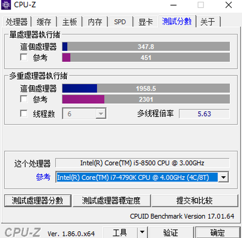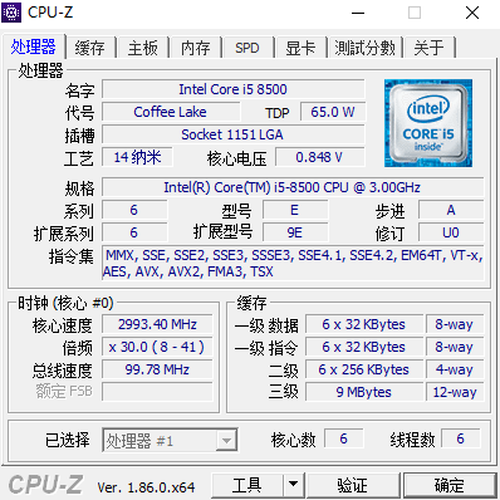i5-8500这颗CPU其实我们大家都已经相当熟悉,作为英特尔中端市场的出货主力,在不少游戏PC上都有采用,其为六核六线程设计,主频为3.0GHz,TDP为65W,通过CPU-Z测试其性能基本与上一代i7-7700K一致。