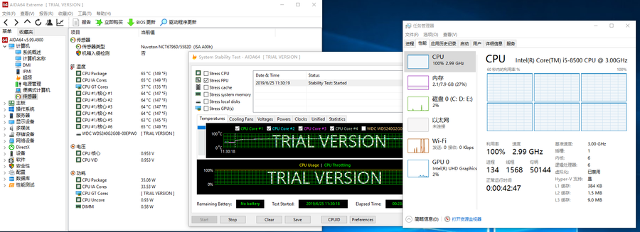 通过近半小时的压力测试,海兰G70Pro的CPU温度最高也仅有64°,这个成绩可以说十分优秀,不过这也是有代价的,烤机过程中CPU频率一直保持在3.0GHz,功耗仅为35W,远未达到i5-850065W的TDP,也就是说在性能调度方面有些保守了。不过从另外一个角度想,大部分一体机用户看重的就是机器的稳定性,性能调度保守一点也可以理解,并且这套散热器对于i5-8500而言还是比较轻松的,日后要更换性能更好的CPU时也不用担心散热问题。