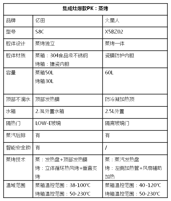 两款产品的全称是:亿田S8C蒸烤独立集成灶和火星人X5BC蒸烤一体集成灶。从名字就可以大概看出他们之间的区别,一个是蒸箱和烤箱独立的,一个是蒸烤和烤箱一体的。