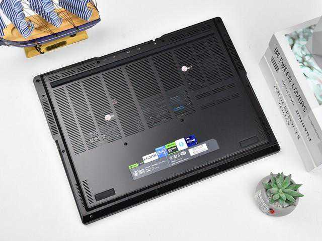 这款笔记本的底部同样大有看头,硅胶防滑条在提供支撑的同时可以起到优化散热的效果,中间是大面积的进风孔,内部是VC均热板散热系统,散热面积增加30%,新设计的风扇增加了30%的进风量,最终提供了高达185W的散热功耗。