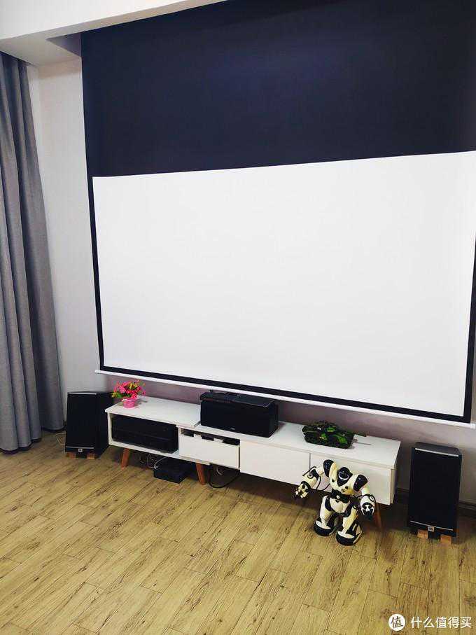 几点补充,因为房间窄,所以100寸幕布放上后,音箱照常规高度,都没位置放了,只好放在幕布下面,为了指向效果好,在音箱下面垫了一个木三角,增加斜度指向。喇叭是JBL书架箱配雅马哈中置加环绕。不喜欢小卫星箱,所以还是搞了套书架箱,目前还缺一个低音炮,怕楼下的找上来。