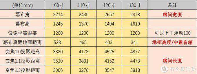 2、在最终确定幕布高度之前,我们先来看看幕布尺寸。家庭用幕布基本就是16:9了。我们可以查一下下面的这张速算表,这个表假设幕布底部黑边高度50mm,投影机加背后接线总深度300mm。