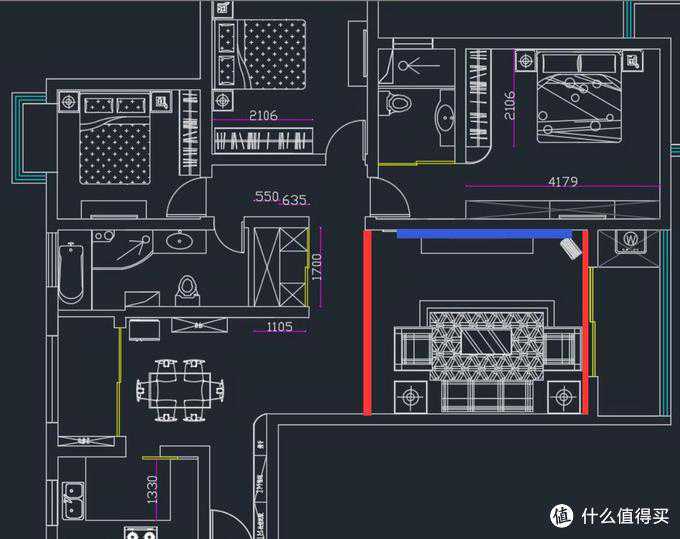 还有,这个房间加上了一个中间遮光布电动窗帘。就像下面这个户型,一般客厅和餐厅挨着。为了营造一个家庭影院的白天观影环境,可以在中间红线区域加一个顶天立地的电动窗帘。不用的时候收到两边。阳台和客厅之间的窗帘也用遮光布,这样就可以营造一个很好的观影环境了。遮光布不仅遮光,隔音,如果开空调还可以减少能量损失。