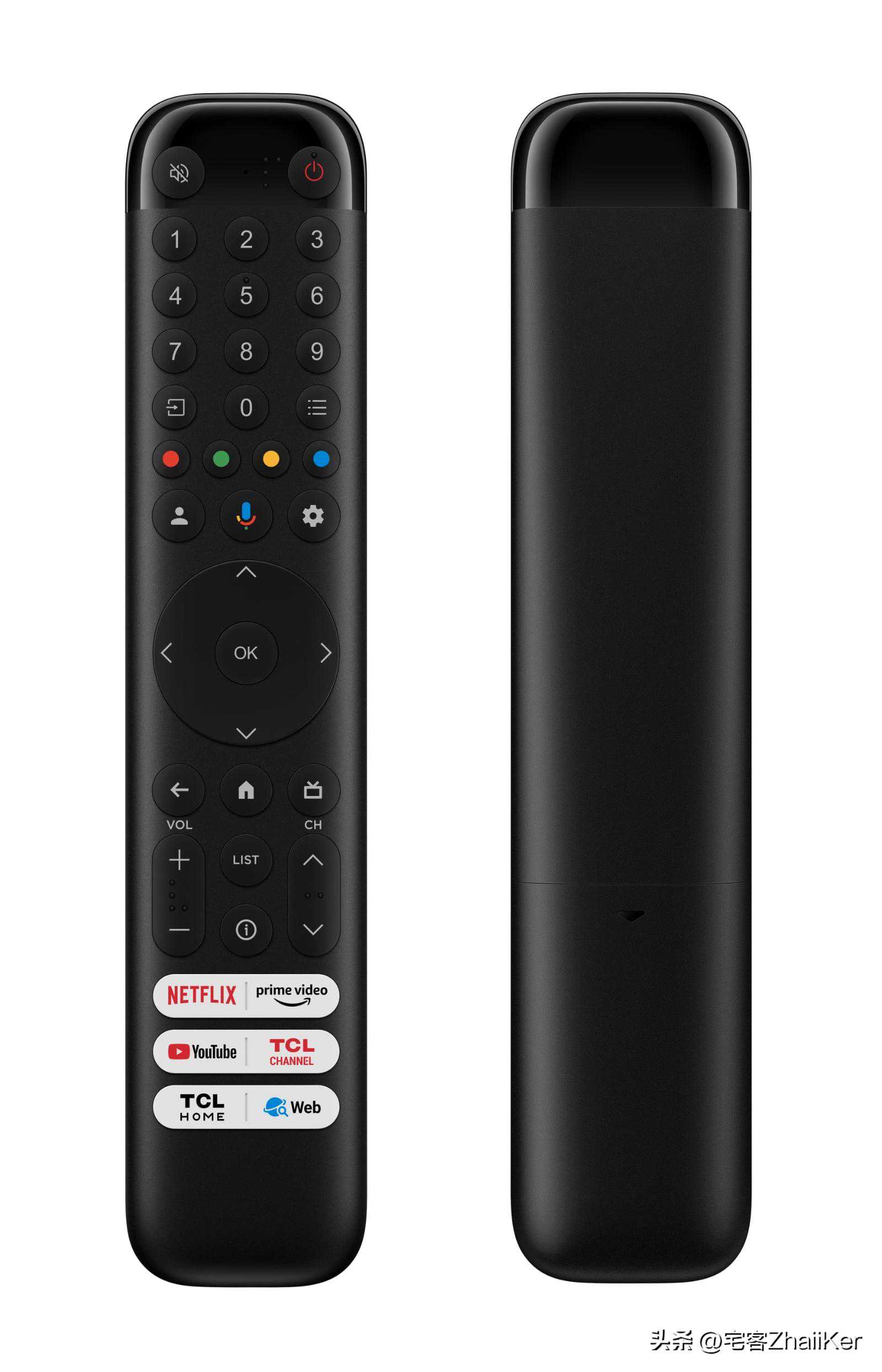 说到遥控器,TCL有一款2023年的新遥控器,采用流线型设计,还有几个用于流媒体服务的赞助按钮。