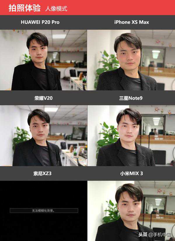 而从背景虚化的程度来看,华为P20Pro、荣耀V20背景虚化效果更加明显,iPhoneXSMax、三星Note9、小米MIX3的虚化程度没有前两者这么夸张。索尼XZ3没能成功将背景虚化。