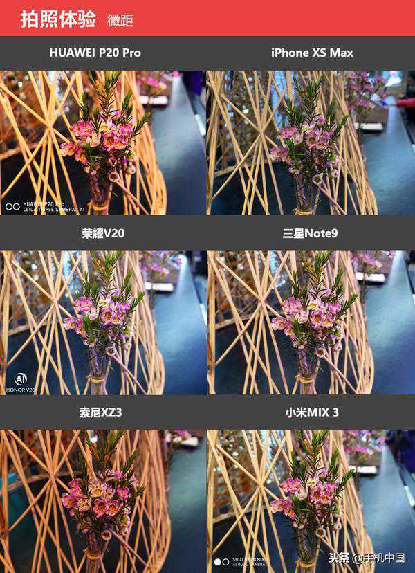 iPhoneXSMax、三星Note9、荣耀V20、小米MIX3虽然也拍出了比较好的微距样张,但是从花色来看,相比HUAWEIP20Pro、索尼XZ3的花色有些淡了,好在图像主体比较清晰。