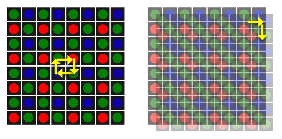 首先将传感器水平移动1个像素,然后垂直移动1个像素,然后再水平移动1个像素,最后再垂直移动1个像素,最终传感器移动一个圈后回到初始位置(如上图的4重拍摄图示)。