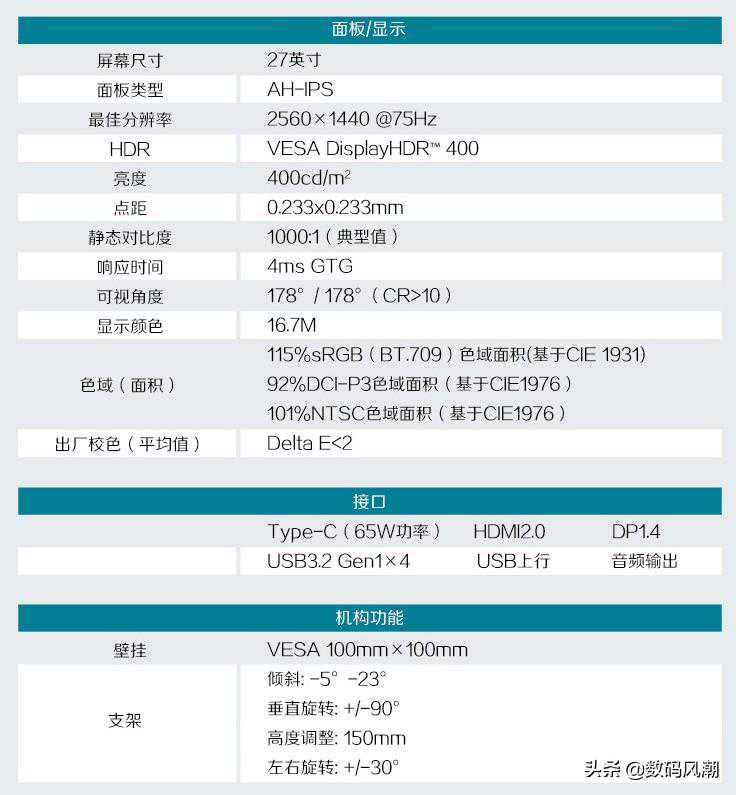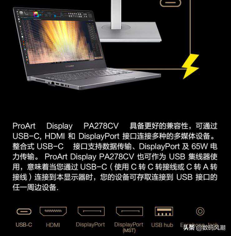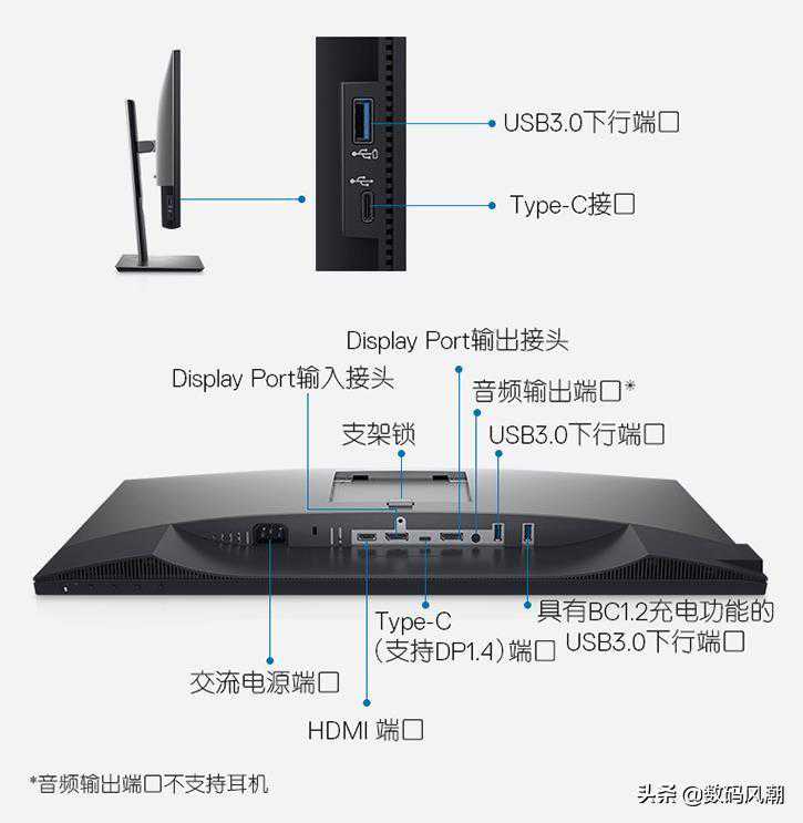 接口方面Type-C、HDMI、DP、、3.5mm多接口一应俱全,除此之外内置双扬声器的配置与明基显示器相同,这点其他品牌希望有所跟进。
