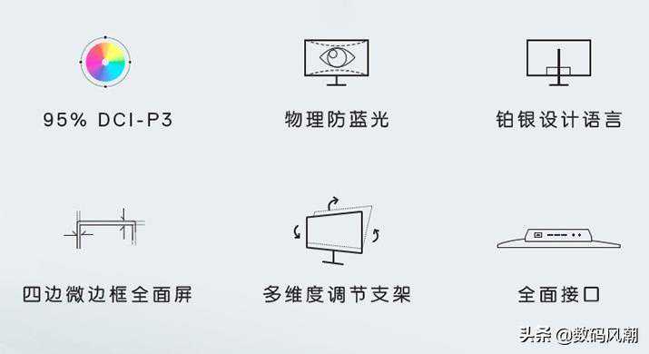 变好看的同时,作为要扛起主销量的身份,性能也不能拉垮。2KIPS,硬件低蓝光,DC调光,10bit色深,95%DCI-P3色域,四窄边框设计,支架多角度调节,色准△E≤2,TUVConfortViewPlus认证都给安排上了。
