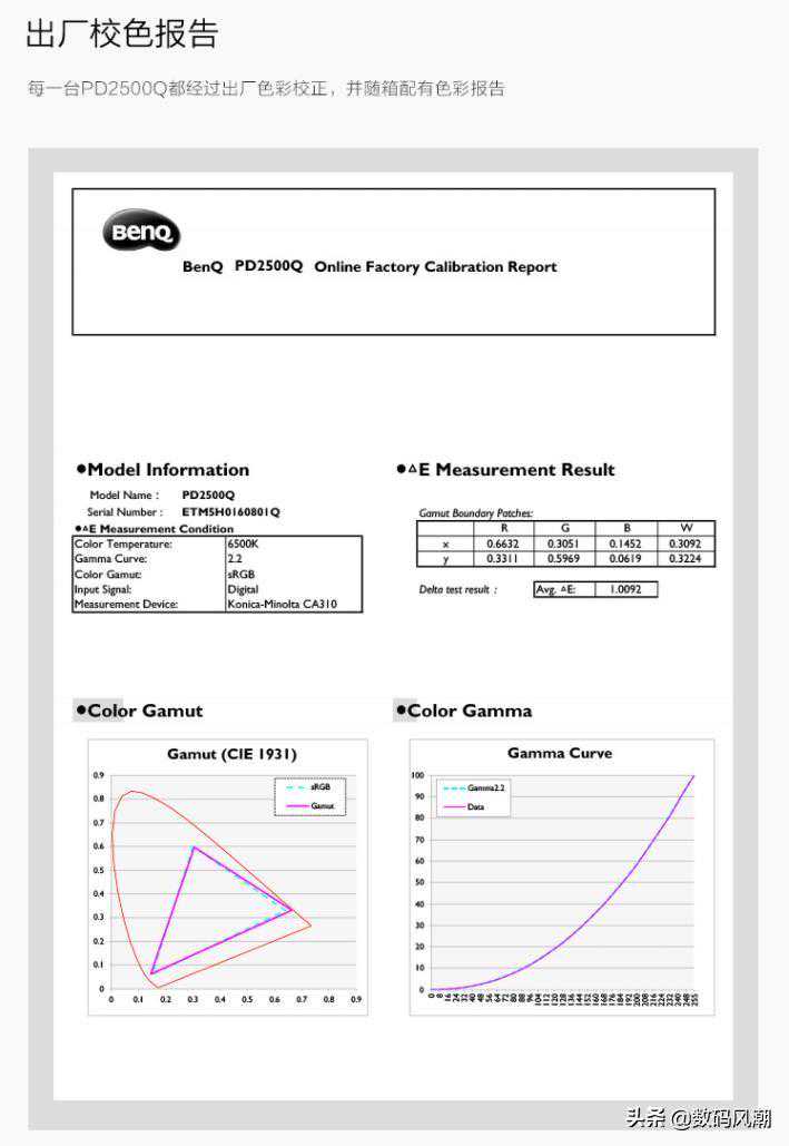 除了常规参数在同级别大相径庭,每台PD2500Q还出具了色准报告,这比多少ΔE、色域覆盖一个理论参考值有意义多了。