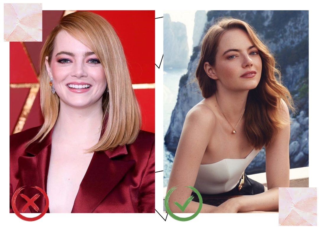 具体到发型上,避免直短发或者单一的内扣,尽量让那个头发多一些凌乱感、起伏度。