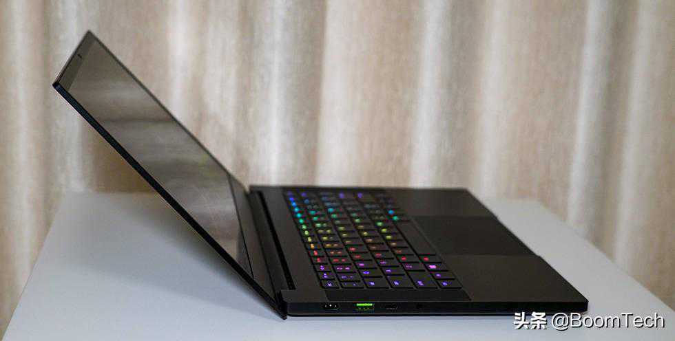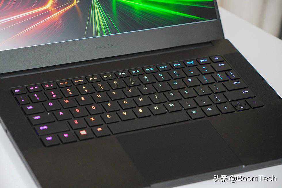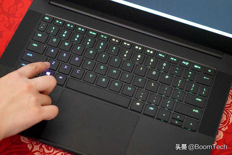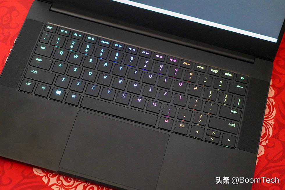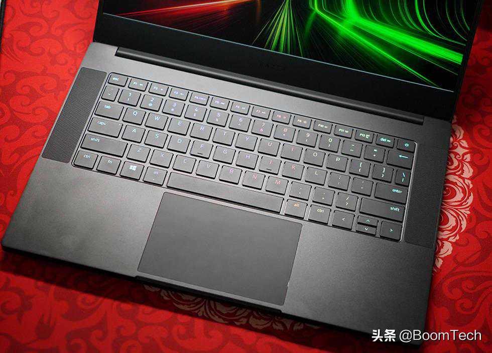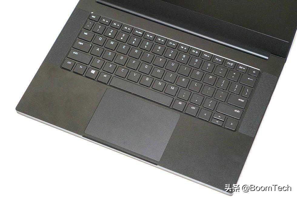 机身C面,CNC一体成型金属机身,手感非常好,但是掌托部位也确实比较容易沾染指纹;触控板很大而且是居中的位置,比较符合“位置强迫症”用户群;键盘布局和雷蛇13寸笔记本高度相似,和15寸/17寸略有不同,初期上手使用时需要适应;扬声器分别位于键盘左右两侧。