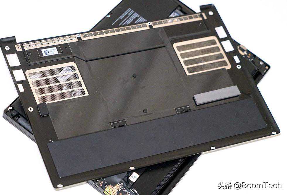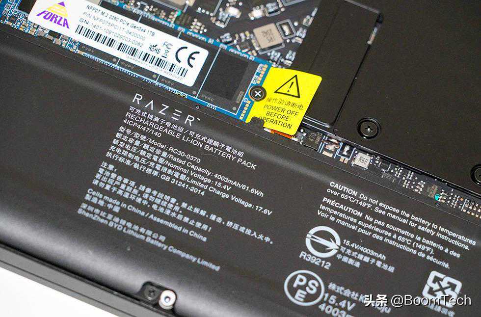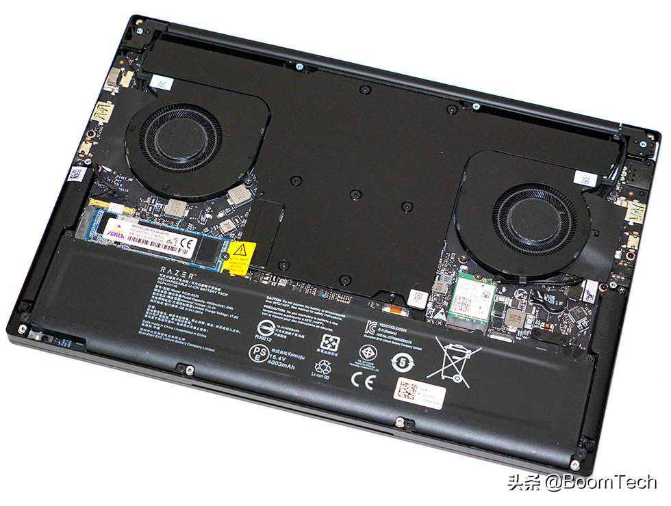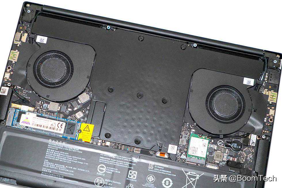 拆卸下D壳就能看到机身内部构造了,不过固定D壳的螺丝为花型六角的,需要提前准备对应的螺丝刀;雷蛇灵刃14锐龙版的D壳卡扣很少,跟灵刃15的差不多,这点要大大的好评。机身内部可以说是整洁到令人发指……甚至在灵刃15精英版上面出现的那个大长条的屏幕排线在这台灵刃14锐龙版上也都被优化下去了,整个内部最吸引人的就是这块巨大的均热板了。