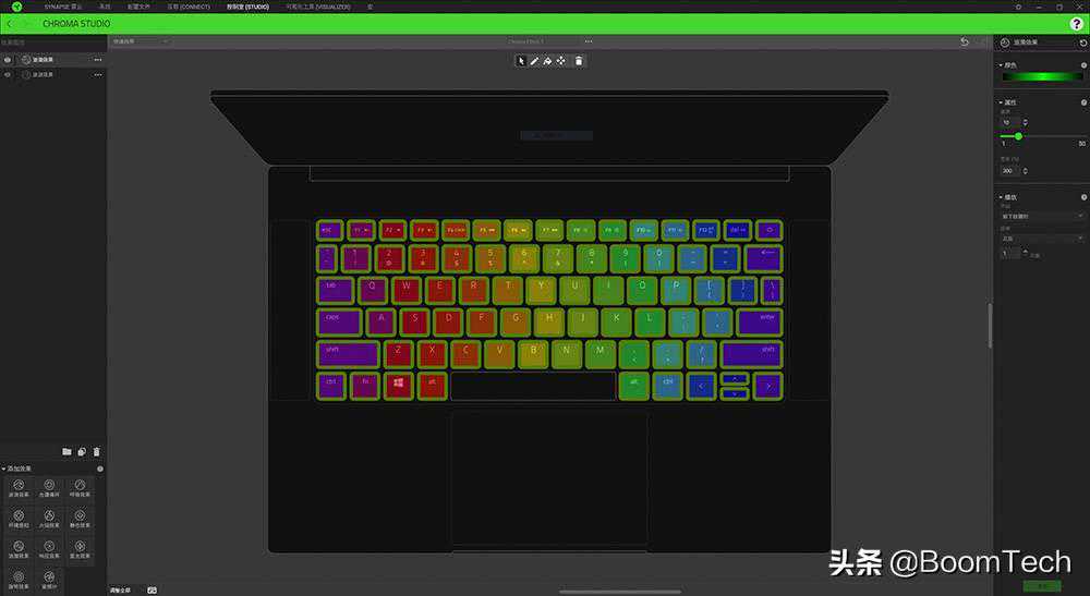 键盘则是单键可调RGB背光,而且在雷云3软件里可以玩出很多花样来。比如说我把默认灯效调成了彩虹波,然后又额外增加了一个键入涟漪灯效图层,这样就可以做成组合效果了,总之灵刃14锐龙版非常适合那些对RGB灯效非常有想法的玩家群。