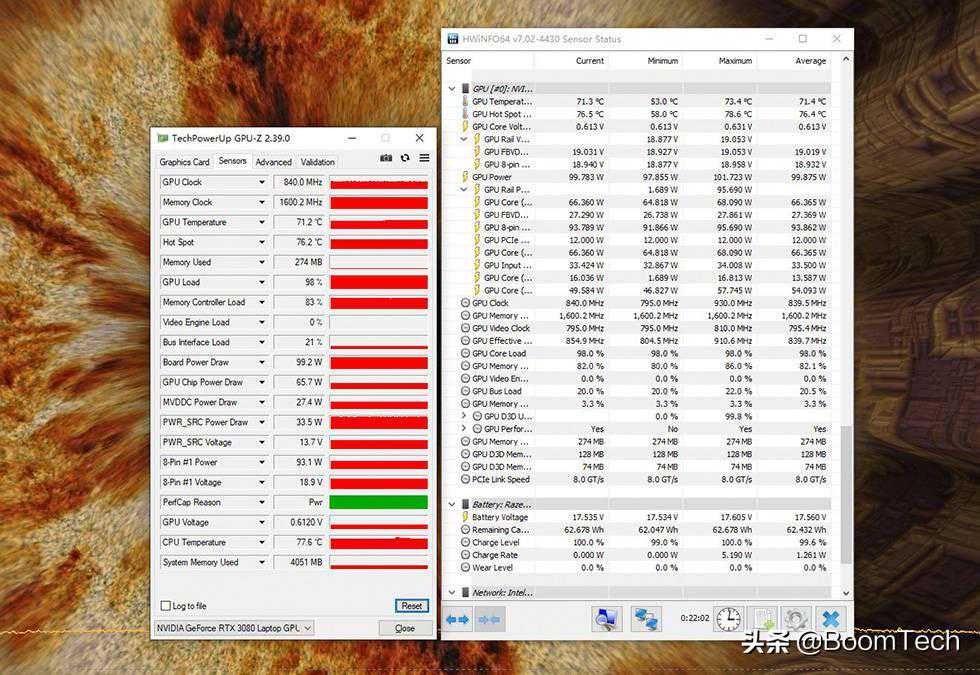 然后是这颗8GB显存的RTX3080Laptop,90w+10w的功耗设计,8GBGDDR6三星显存,在单烤Furmark测试中,这颗RTX3080可以稳定做到100w的性能释放,核心温度大约在72度左右。C面温度控制的依旧不错,虽然比单烤FPU的表面温度高一点,但是好在C面最热的区域还是相对远离核心使用的键位区的。