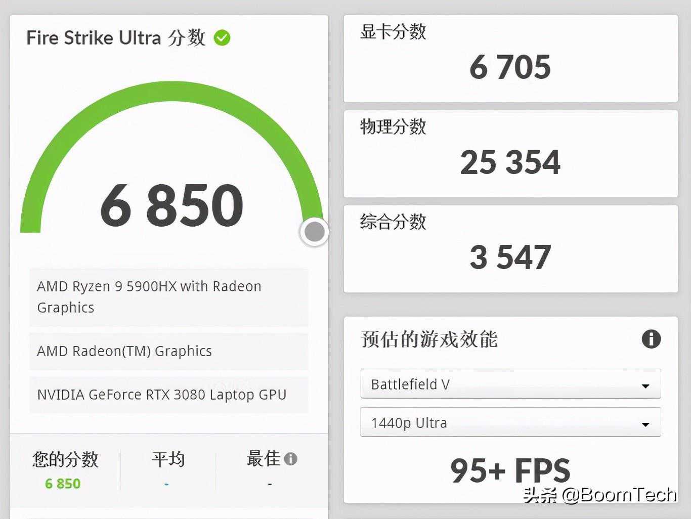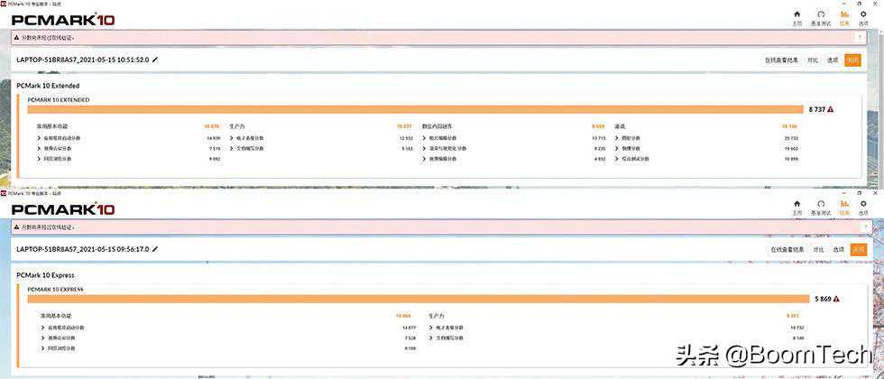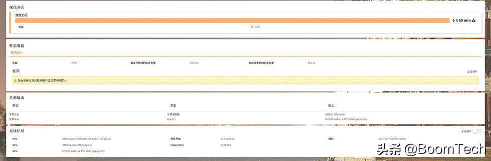 PCMARK10测试环节,灵刃14锐龙版的现代办公续航测试可以坚持将近6小时,这个成绩在小尺寸+高配置的机器上,我个人还是满意的。另外得益于R9+3080的配置,PCMARK10的综合测试成绩也很出色。