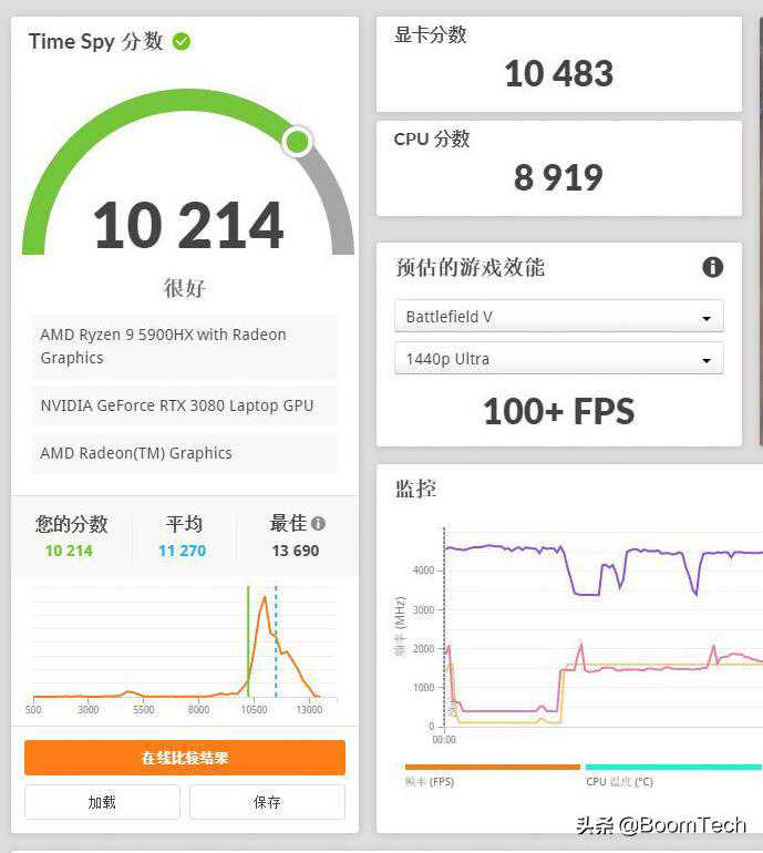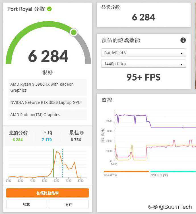 3DMARK跑分环节,这颗RTX3080在各项跑分中均可以冲到100w功耗,从实际跑出来的分数来看,这张显卡可以轻松应付各路2K分辨率下的3A大作,当然了,在TimeSpy和PortRoyal测试环节,整体成绩也确实低于平均值,这个跟这颗3080只能做到100w有关,不过也别小瞧100w的3080,它终究还是要比140w的RTX3070强,正所谓“底大一级压死人”嘛。
