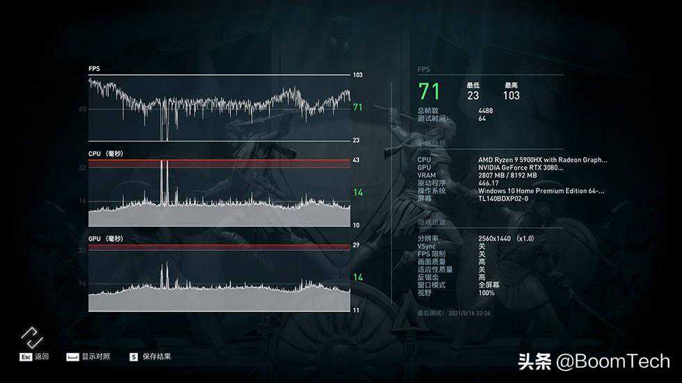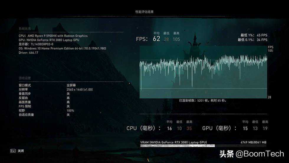 游戏实测部分,灵刃14锐龙版这个R9+3080的配置可以比较轻松的应付2K分辨率下高画质的刺客信条奥德赛和英灵殿。