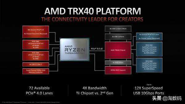 TRX40看起来是X570的高端版本,规格有些相似,但是总线带宽为,所以TRX40的芯片组理论带宽对X570是翻倍的。