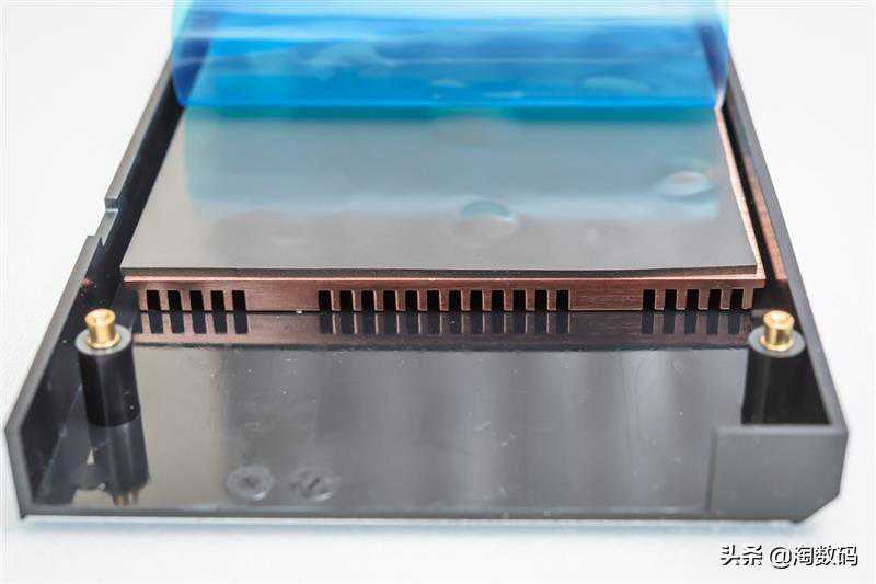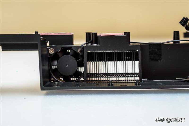 打开外壳就可以看到内部的风道设计,扩展卡对对SSD正反面都贴合导热垫,正面还额外有铜质散热片。