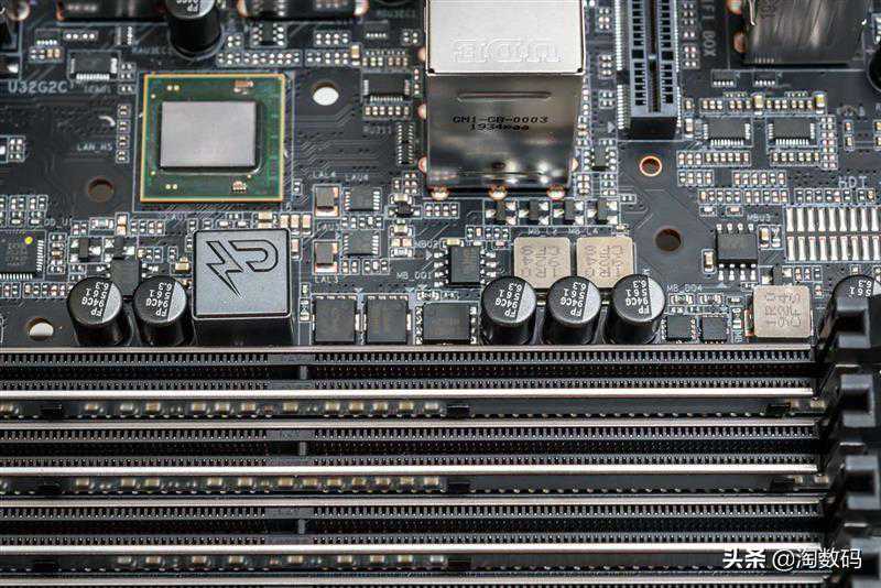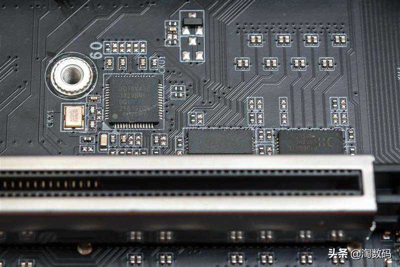 由于TRX40的PCI-E通道非常充裕,所以显卡插槽和插槽均不需要做通道切换,图中8颗长方形芯片均为中继芯片,型号为PI3EQX16。另外还配了1颗时钟芯片IDT6V4。他们的目的都是更好的控制主板的PCI-E信号稳定性。