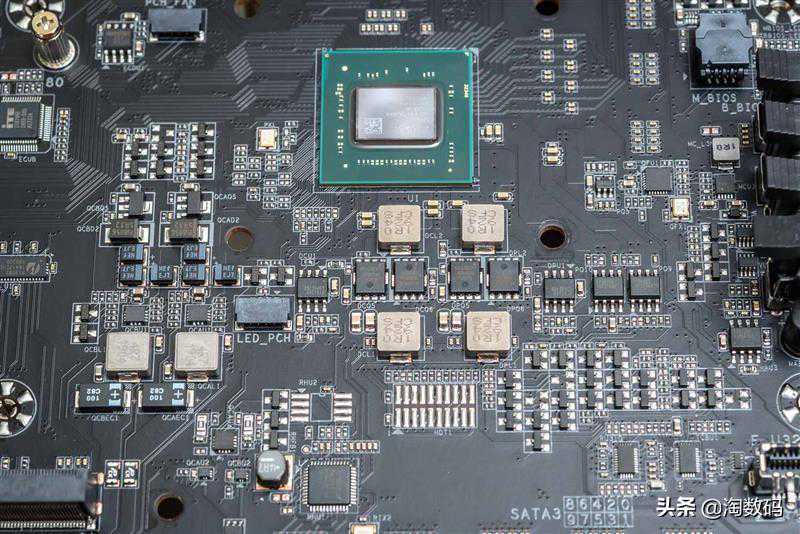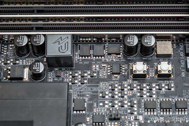 主板内存供电为两侧各1相,输入电容为2颗固态电容,型号为尼吉康的FP电容,容值560微法,电压6.3V;MOS为一上两下,型号为安森美的4C06N;输出电感为一颗R30封闭式电感;输出电容为2颗固态电容,型号为尼吉康的FP电容,容值560微法,电压6.3V。