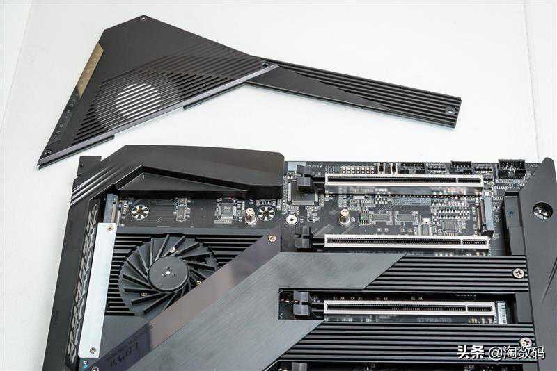 可以很明显的看到,TRX40在堆供电和散热,在比较高端的主板上,为了保证供电温度稳定,还会额外添加散热风扇。技嘉的风扇藏在IO的罩子下面。