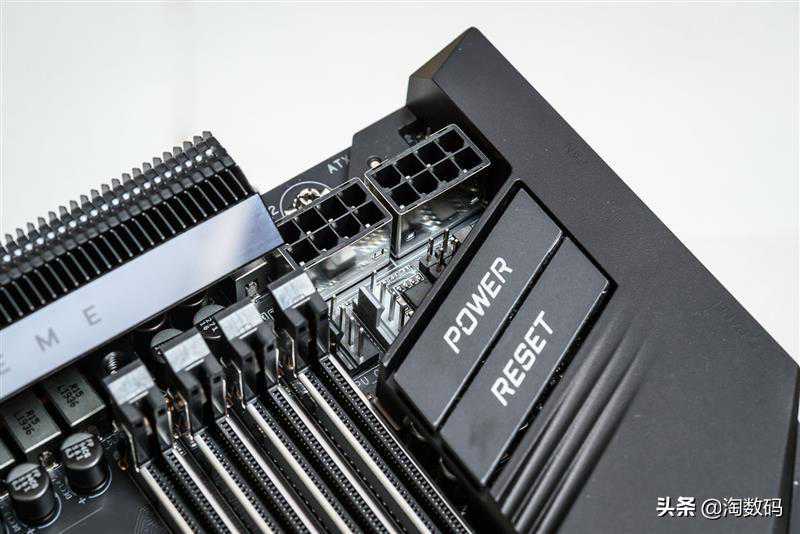 在内存插槽靠24PIN插座一侧,可以找到CPU的外接供电,这次也是要提供双8PIN来满足供电的需求。外接供电下方是CPUFAN和CPUOPT,以及两个温度传感器。更下方的地方有电源和重启两个按键。