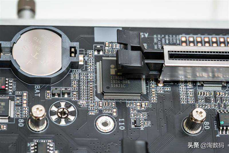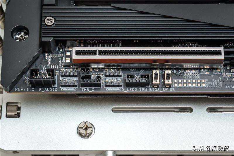 由于大量插座集成到了主板的侧边,所以主板底部的插座就减少了很多,图中右起分别为,电压检测点、BIOS切换开关、miniTPM、RGBLED*2、VDG数字LED*2、雷电扩展卡接口、前置音频。