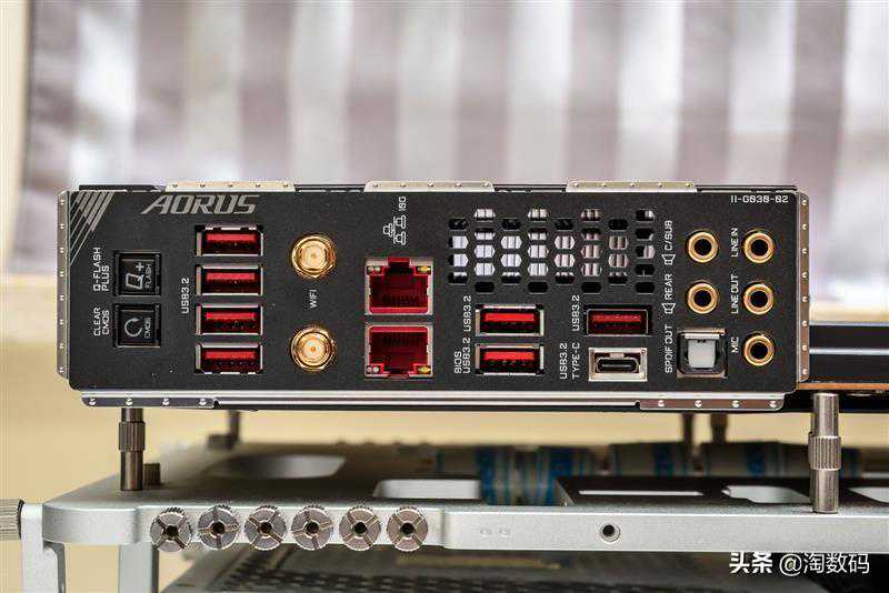 主板后窗接口还是比较丰富的,图中左起分别为CLEARCOMS+Q-FLASHPLUS按钮、*4、WIFI天线、万兆网线口*2、*2、+C、3.5音频*5+数字光纤。