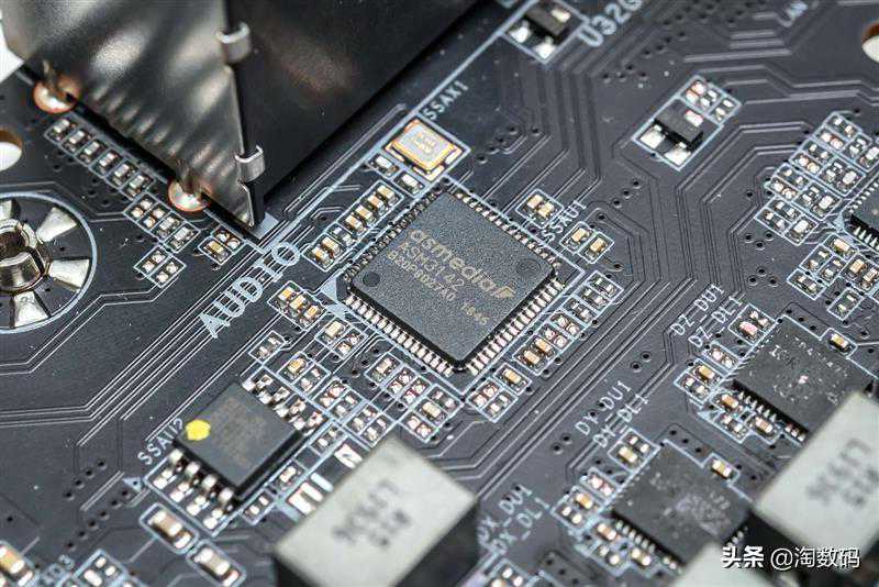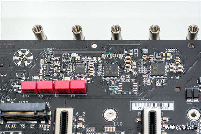 主办的音频部分做的颇为复杂,前置插座采用1颗ESS9218DAC芯片+1颗ALC4050功放芯片。后窗接口则为1颗ALC1220-VB+1颗ALC4050功放芯片。对于主板来说已经是比较豪华的设计了。