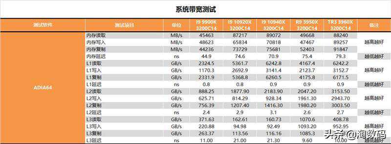 系统带宽测试,由于采用四通道平台,TR33960X的内存带宽相当高,同时得益于架构上的优势,L2、L3缓存的性能也是吊打Intel的10-X系列。
